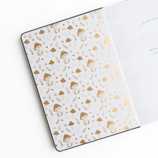 • Archer and Olive Mushroom Notebook Dot Grid Spring 2025 Collection Double Mushroom Gray Cover featuring a double mushroom pattern debossed in gold available in sizes A5, B5, and Traveler's Notebook.