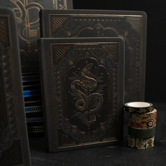 • Snake coiled around a key cover. Archer and Olive Halloween Notebook. Black notebook with gold embossed design on a black background