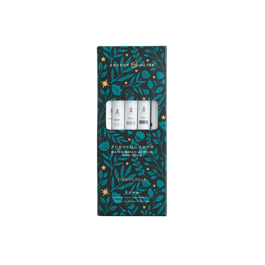 • Archer and Olive Halloween 2025 Acrylograph grayscale pens Set of five white markers with black accents on a white background