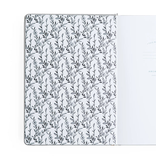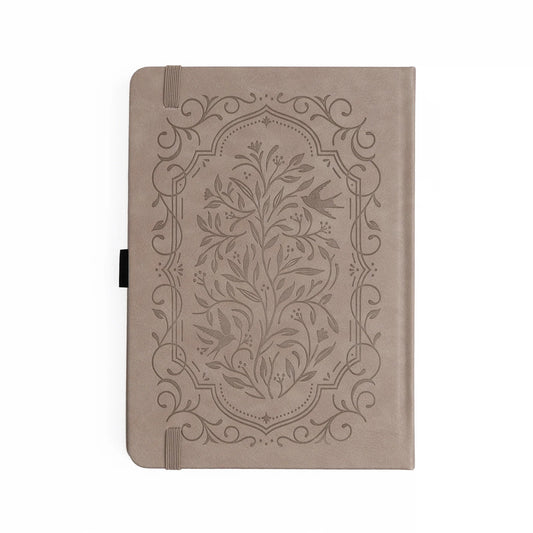 • Archer and Olive Gray notebook with floral and bird design on a white background
