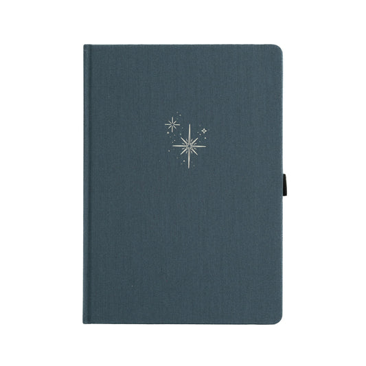 A teal Archer and Olive Starbright Notebook with a sparkle design on the cover, featuring a pen holder and elastic band.