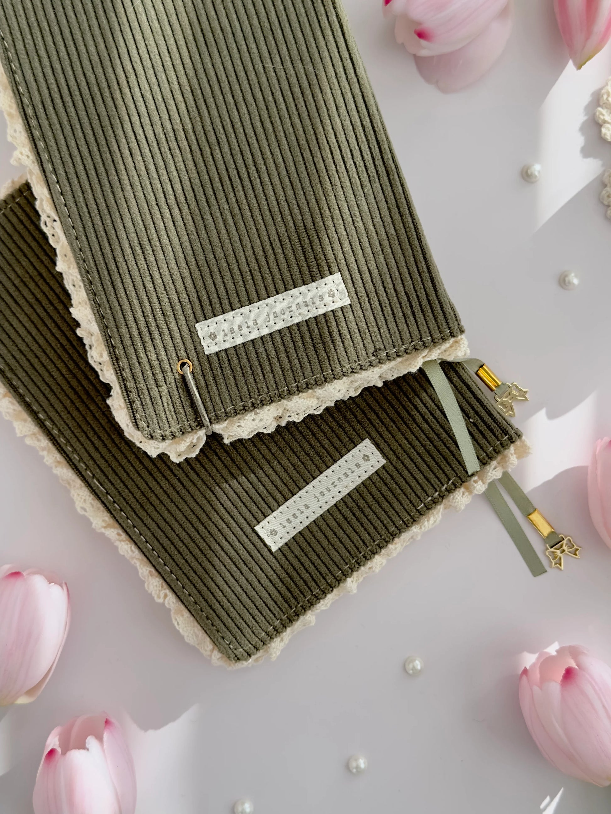 limited edition bear notebook - wrapped in soft green corduroy fabric, lined with ruffles, & sewn on embroidered patch. no bleeding or ghosting with most markers, pens, & ink. (can add sticker patches to cover for extra personalization!)