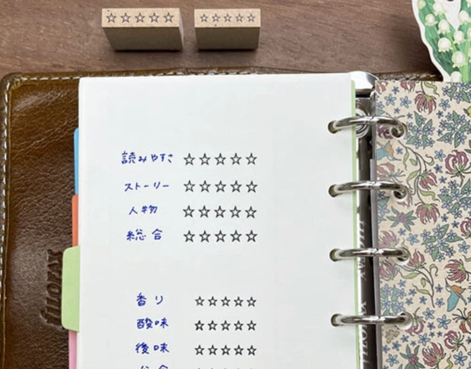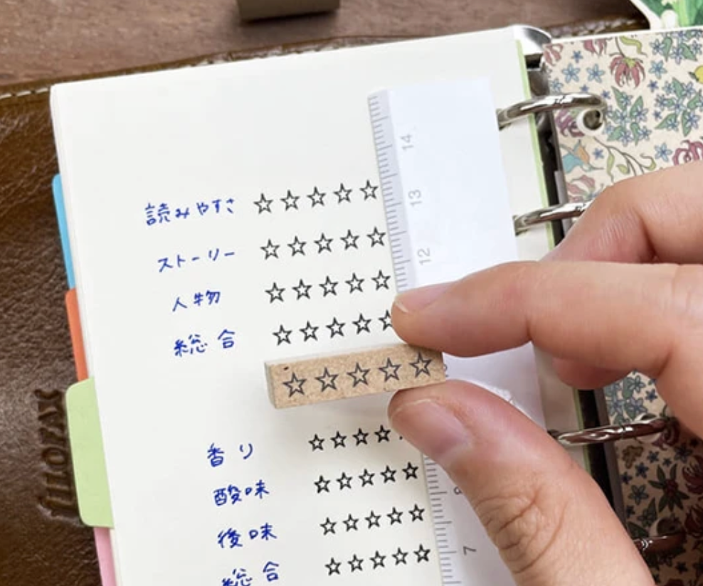 This is a 5-star stamp. It can be used in combination with other record stamps such as [Record Reading] or [Record Movie*Drama], or used as a review stamp by placing them vertically side by side, or as a star-shaped checklist stamp by placing them vertically. The size is easy to stamp on a notebook, fusen, or other memo pad.