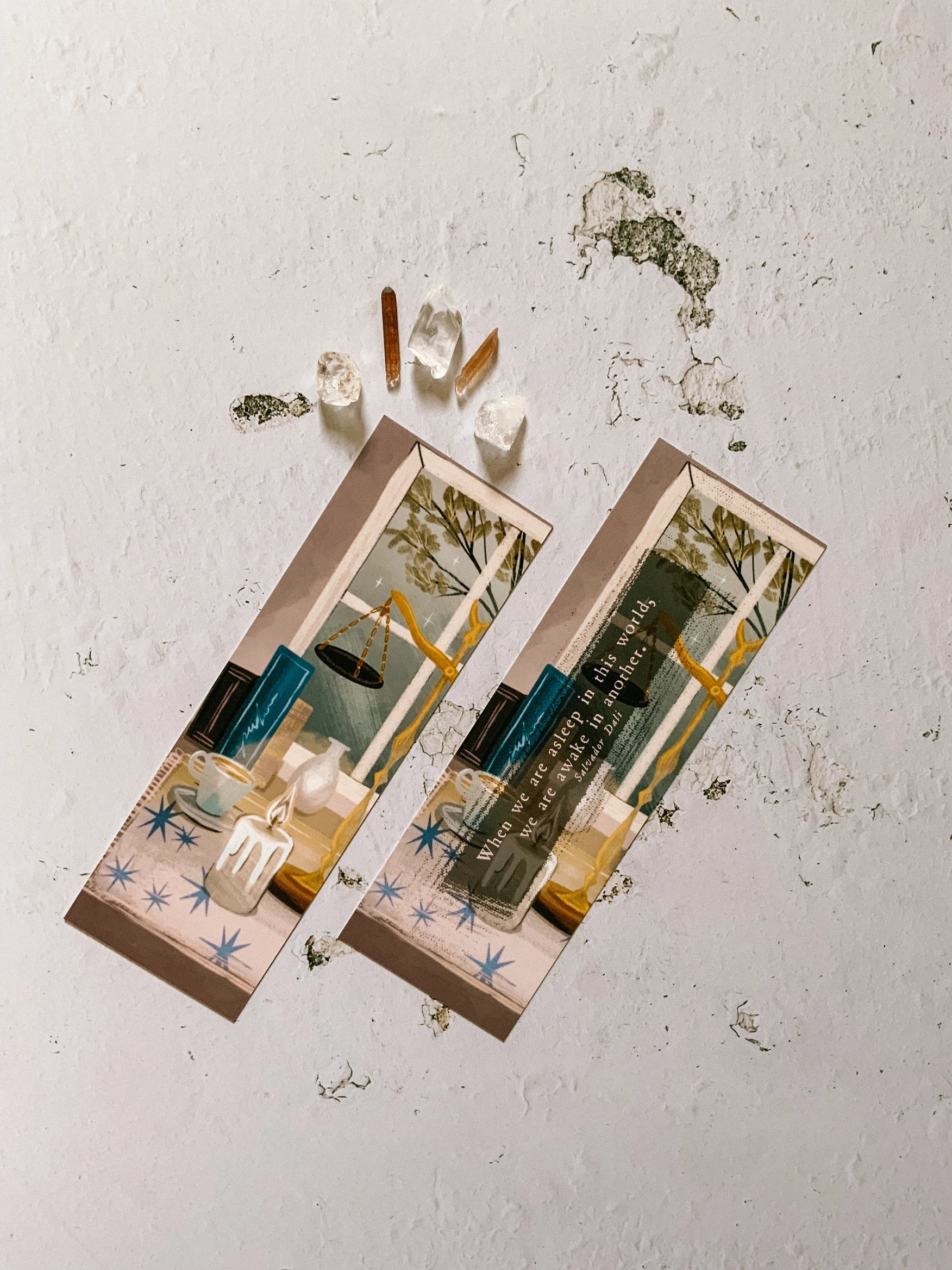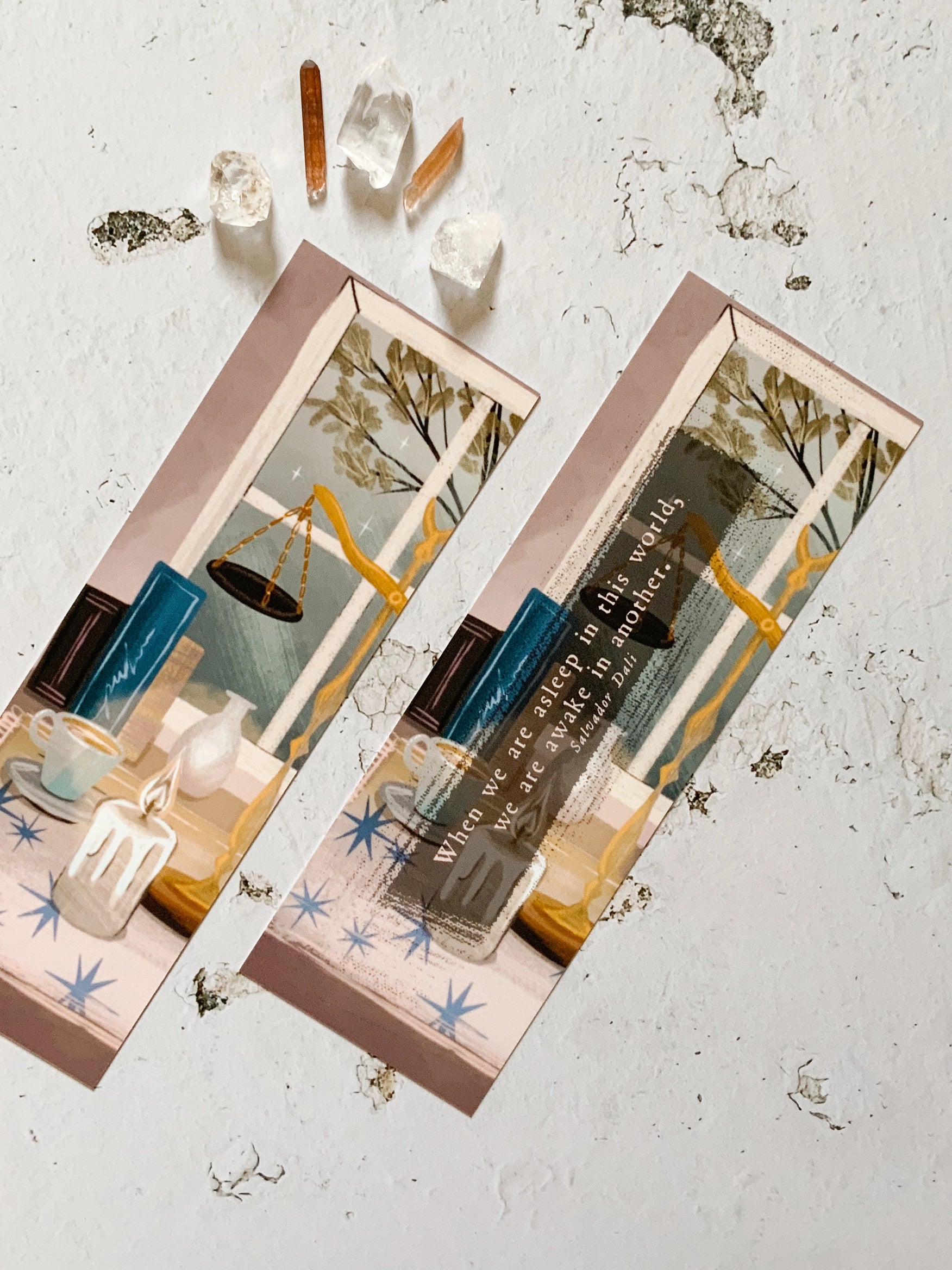 Bookmark featuring a famous quote "When we are asleep in this world, we are awake in another" by the artist Salvador Dali. Featuring a cozy window still life including a lit candle, hot drink, books, curios, and a scale. - 6"x2" size - 150# Cover stock - Soft-touch coating - Square Corners - Double Sided