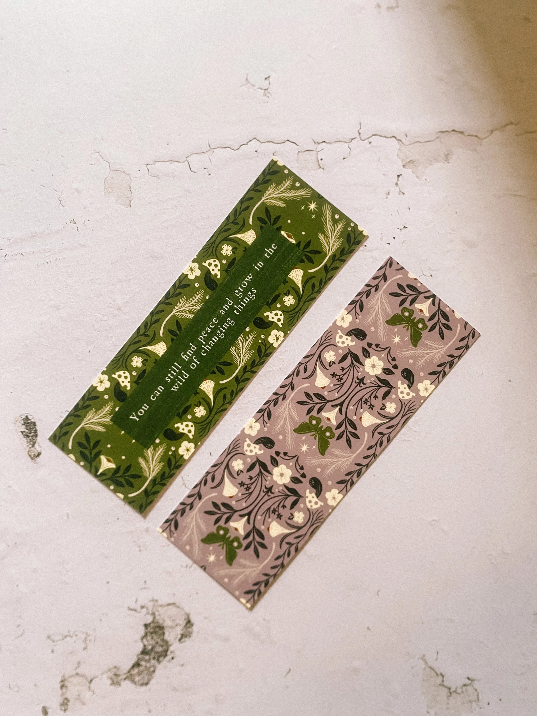 Double-sided bookmark featuring fairy forest artwork with the quote "You can still find peace and grow in the wild of changing things". - 6"x2" size - 150# Cover stock - Soft-touch coating - Square Corners - Double Sided