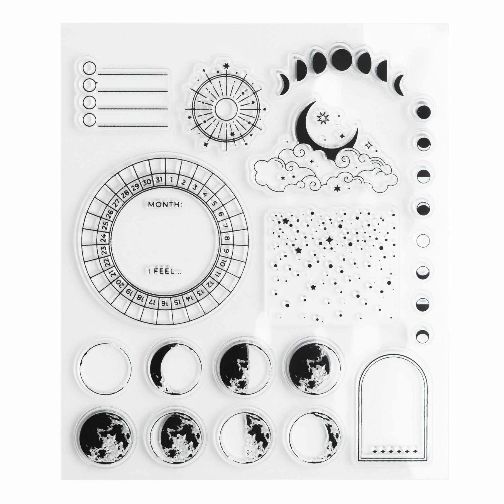 A dreamy, atmospheric clear stamp set inspired by the moon, stars, and shifting sky. Featuring moon phases, constellations, a mood-tracking wheel, celestial icons, and decorative frames, this set is perfect for adding magical, cosmic detail to any journaling or planning spread.