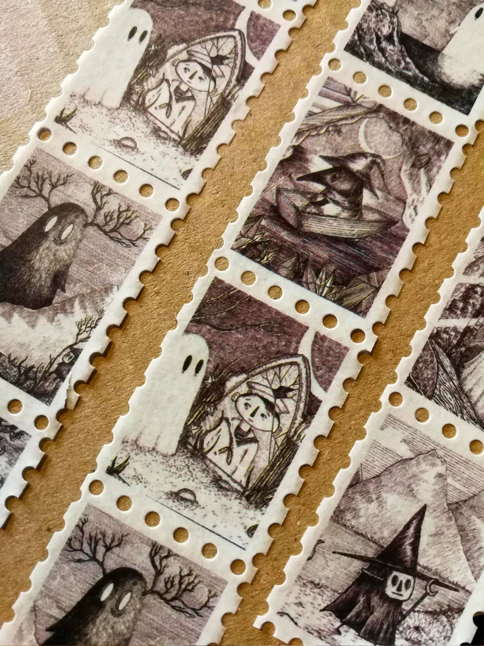 Perforated to look like a roll of postage stamps, this washi tape features a repeating pattern of ten designs in portrait format from hand-drawn pen and ink artwork, recreated in incredible detail at miniature size. It can be applied like a tape, or cut into individual mini stickers; ideal for adding a finishing touch to envelopes, or journalling, or even making a miniature gallery of adorably tiny prints. Perfect for Halloween, or for keeping the spookiness going all year round.