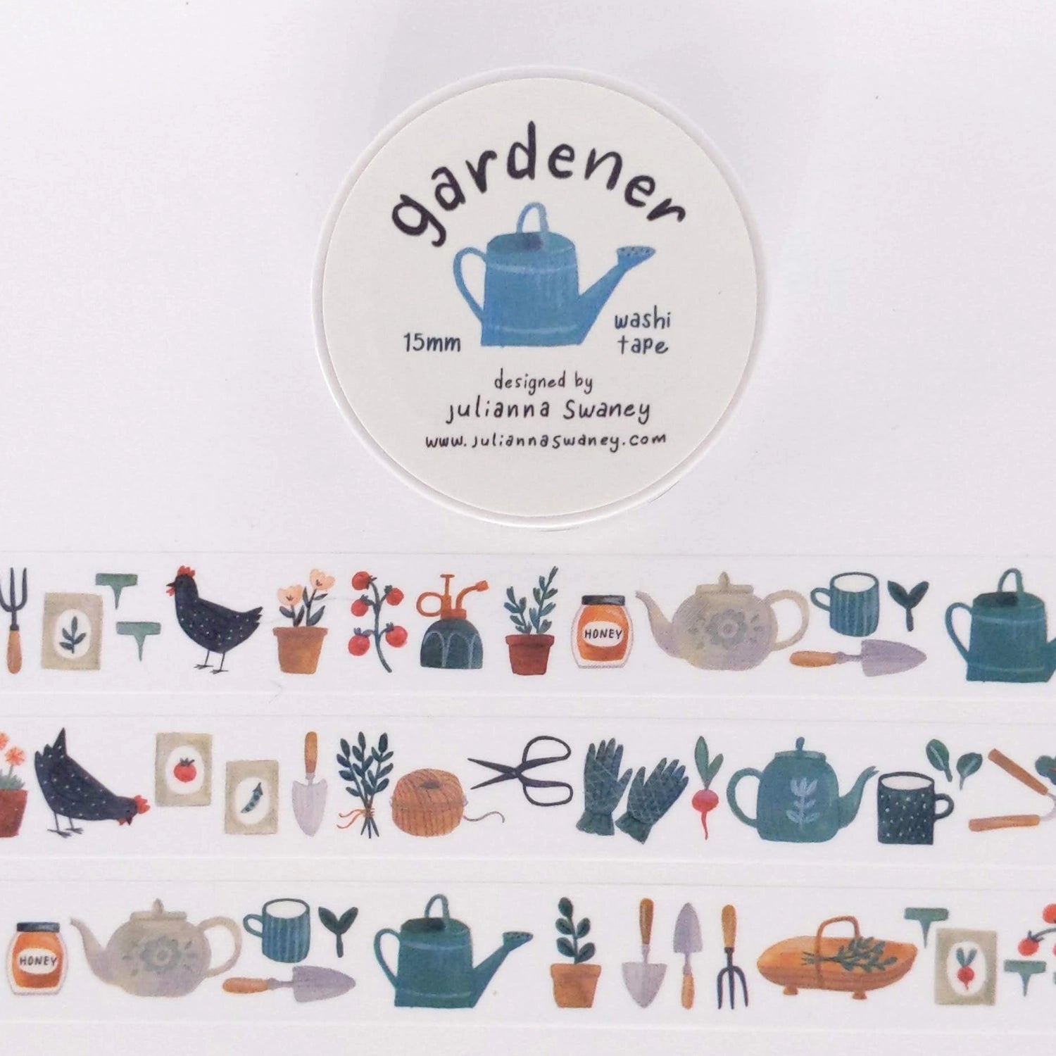 a collection of things gardeners need and love such as gardening gloves, snippers, watering cans, spades and other gardening tools, plants, seeds, even chickens and some tea cups for after all the work is done! Great for gardeners or garden lovers!