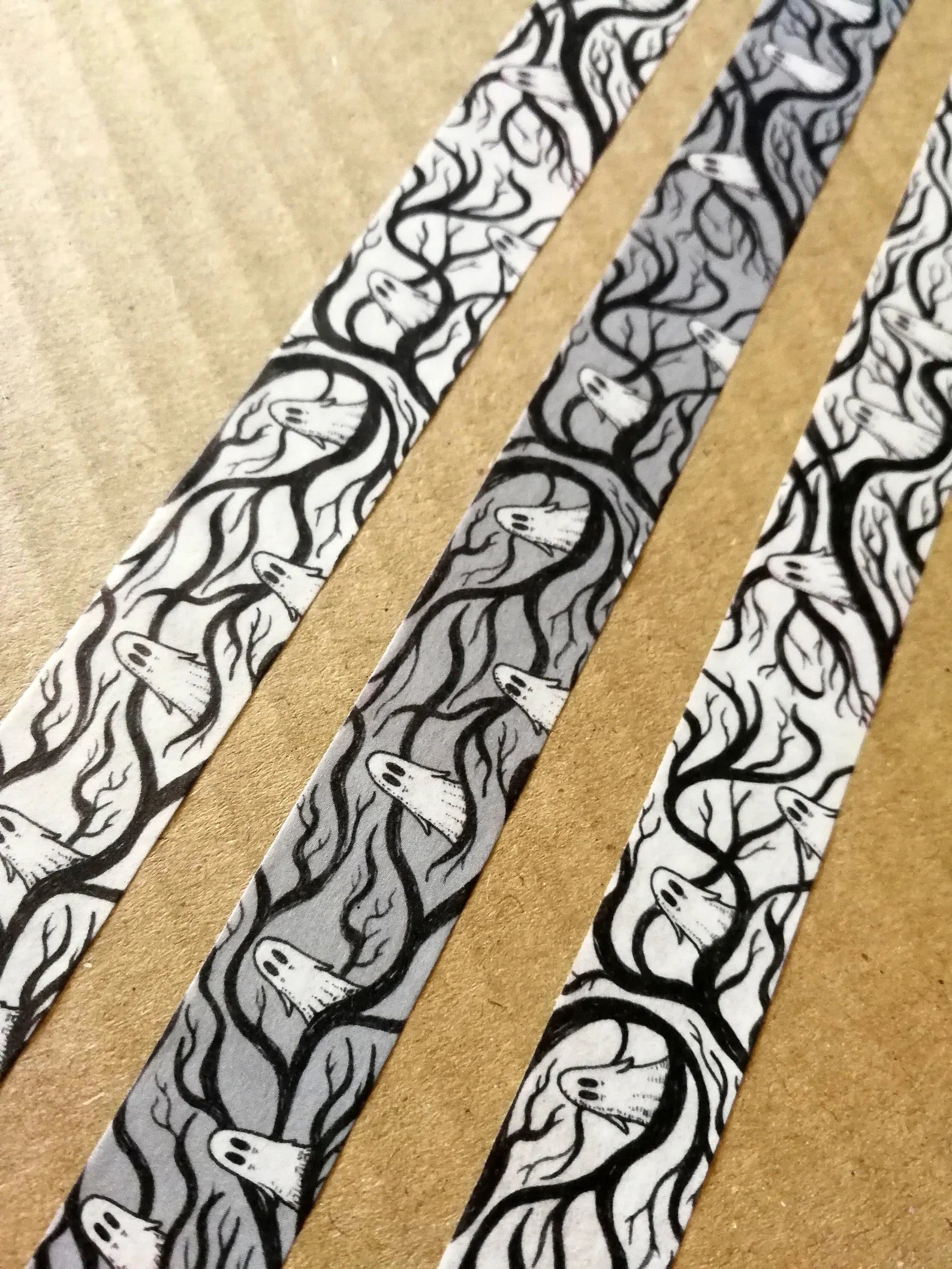 Add a playfully gothic touch to your stationery supplies with these washi tapes featuring little ghosts hiding amongst the branches. Ideal for spooky journalling or curious correspondence, at Halloween or all year round. Available with either a white or grey background, the tape measures approximately 15mm wide, and the roll is 10m long. Each roll is cello wrapped and decorated with branded stickers on either side.