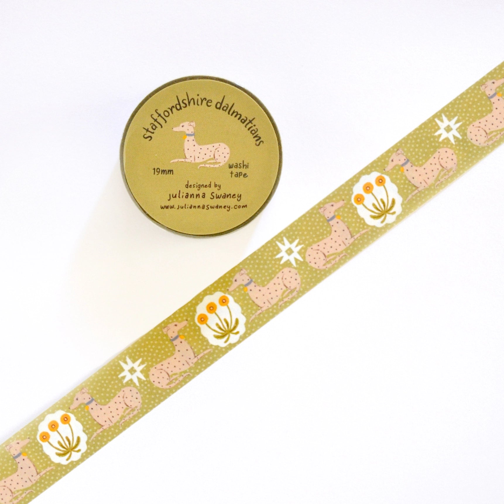This pretty washi tape is made from original illustrations and it features a quirky pair of Staffordshire dalmatians, and an English textile inspired pattern of flowers, stars and polka dots over a background of olive green