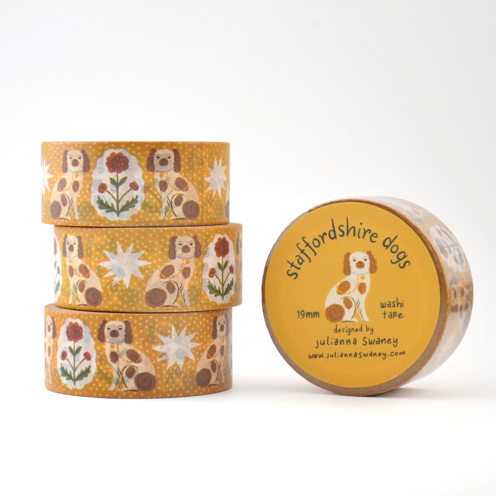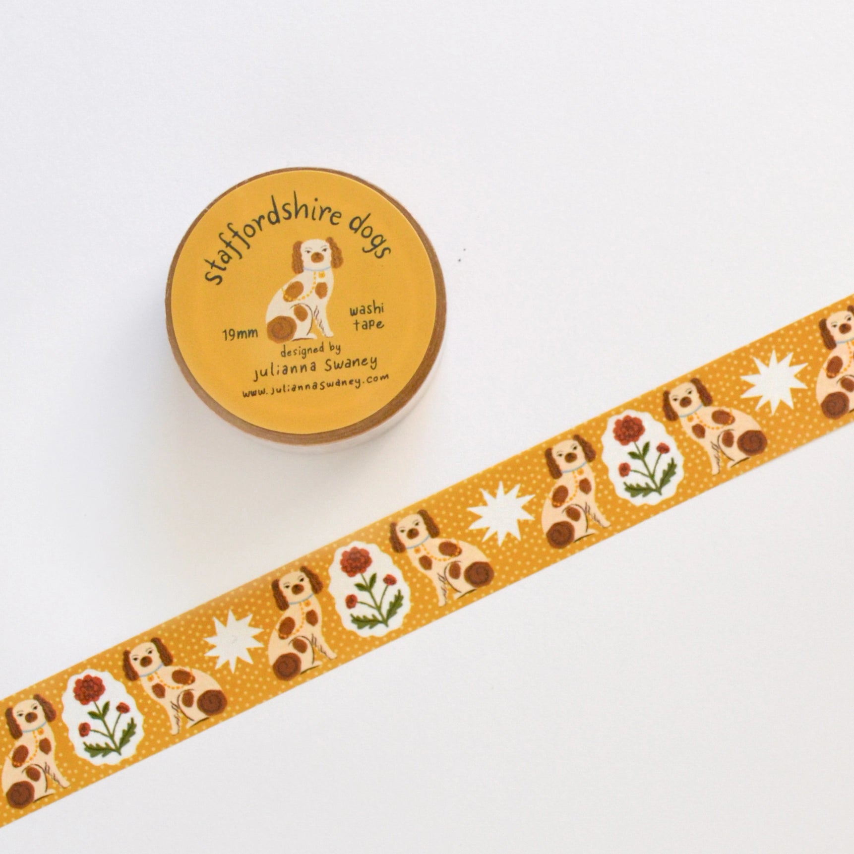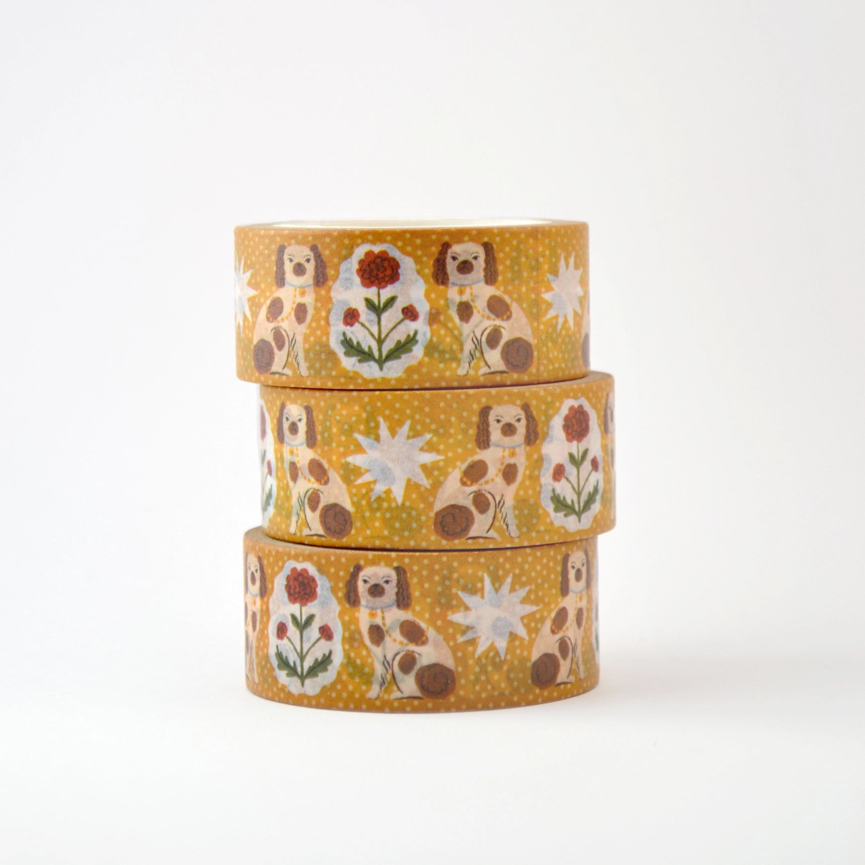 a classic pair of Staffordshire dogs, and an english textile inspired pattern of flowers, stars and polka dots